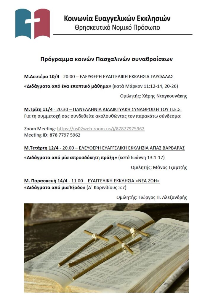 Μ.Δευτέρα 10/4 – 20.00 – ΕΛΕΥΘΕΡΗ ΕΥΑΓΓΕΛΙΚΗ ΕΚΚΛΗΣΙΑ ΓΛΥΦΑΔΑΣ