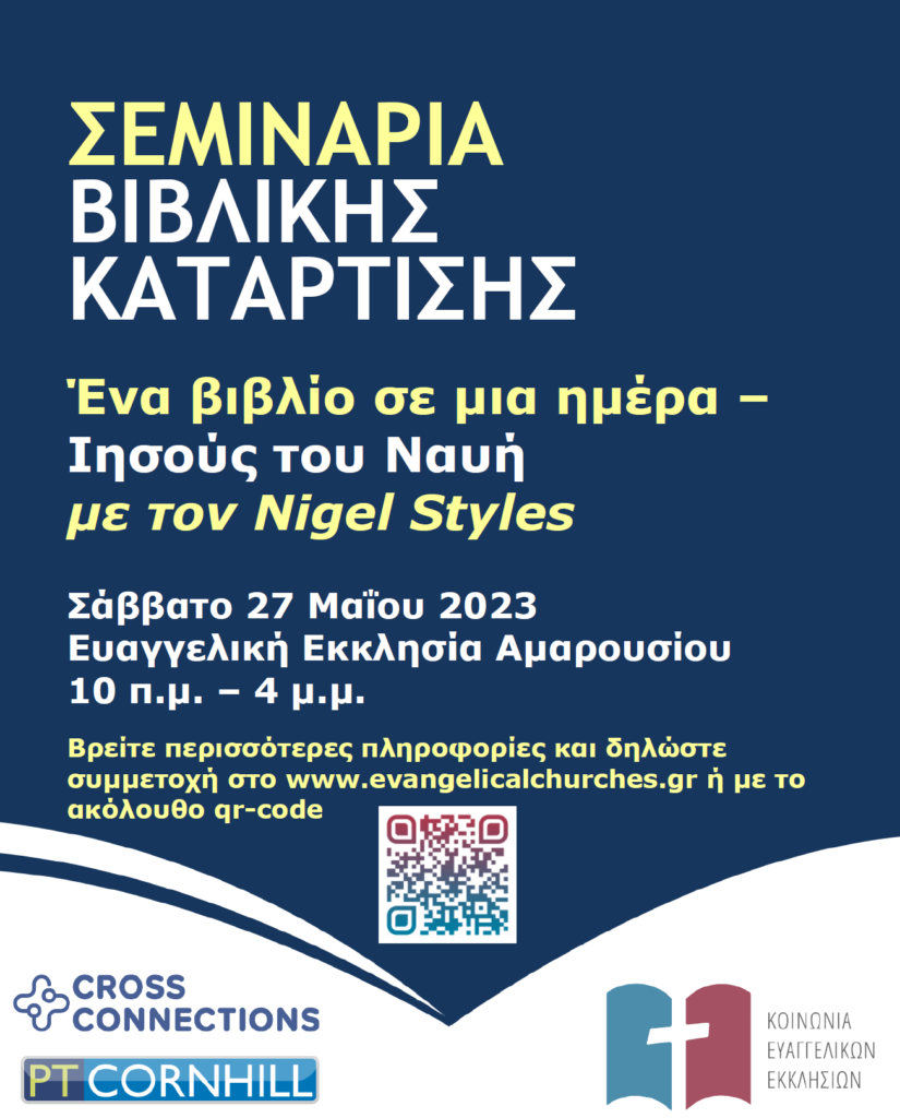 Στο τρίτο σεμινάριο, που θα πραγματοποιηθεί το Σάββατο 27 Μαΐου 2023 θα έχουμε και πάλι μαζί μας τον Nigel Styles, διευθυντή του προγράμματος εκπαίδευσης «Cornhill». Θα ασχοληθούμε με το βιβλίο του Ιησού του Ναυή. Το σεμινάριο θα πραγματοποιηθεί στην Ευαγγελική Εκκλησία Αμαρουσίου (Κοιμήσεως Θεοτόκου 27, 15124, Μαρούσι Αττικής – https://goo.gl/maps/