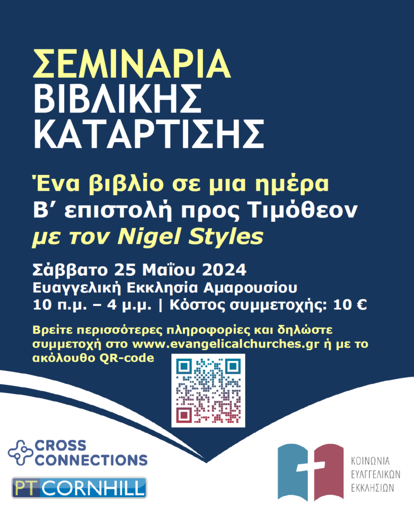 Στο τέταρτο σεμινάριο, που θα πραγματοποιηθεί το Σάββατο 25 Μαΐου 2024 θα έχουμε και πάλι μαζί μας τον Nigel Styles, διευθυντή του προγράμματος εκπαίδευσης «Cornhill». Θα ασχοληθούμε με τη Β’ επιστολή προς Τιμόθεον. Το σεμινάριο θα πραγματοποιηθεί στην Ευαγγελική Εκκλησία Αμαρουσίου (Κοιμήσεως Θεοτόκου 27, 15124, Μαρούσι Αττικής) στις 10:00 με 16:00. Το κόστος συμμετοχής θα είναι 10 ευρώ.