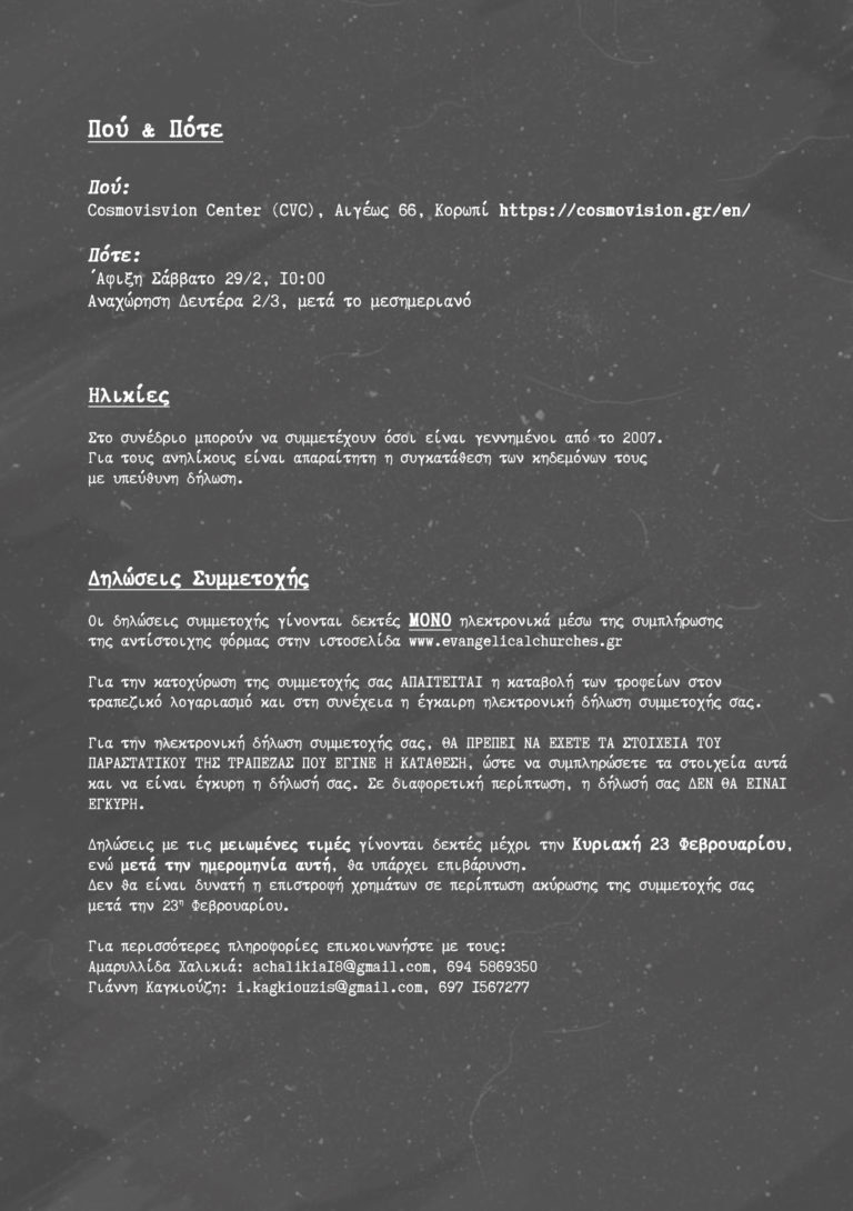 Η οργανωτική επιτροπή αποφάσισε την αναβολή του Συνεδρίου Νέων και Εφήβων λόγω των τελευταίων εξελίξεων σχετικά με την εξάπλωση του κορονοϊού στην πατρίδα μας. Προφανώς τα δεδομένα δεν είναι ξεκάθαρα και οι απόψεις διίστανται κάνοντας έτσι τις αποφάσεις πιο δύσκολες, όμως κρίθηκε ότι είναι το σοφότερο και πιο συνετό το συνέδριο να αναβληθεί. Δεσμευόμαστε να εξετάσουμε εκ νέου πιθανές ημερομηνίες για τη διεξαγωγή του, εφ’ όσον οι συνθήκες το επιτρέψουν.